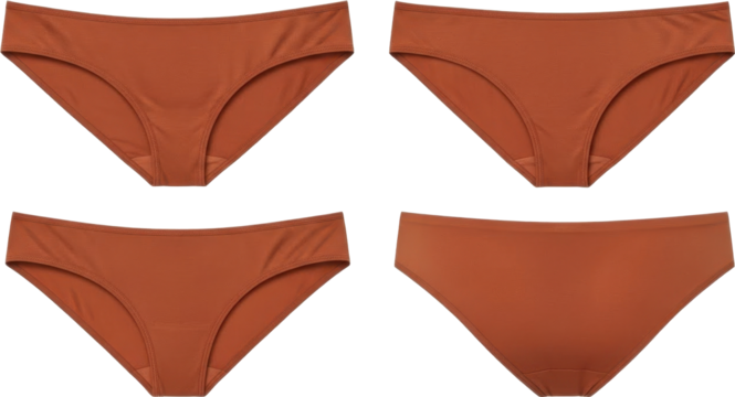 Four identical pairs of womens rustcolored bikini bottoms arranged symmetrically.