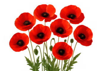 Red poppies growing with green stems and buds, signifying remembrance and nature, on transparent background