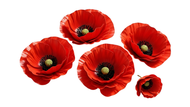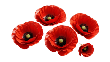 Red poppy blossom with vibrant petals and dark center, symbolizing remembrance and peace, isolated on transparent background