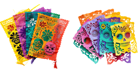 Miniature Papel Picado Banner, Colorful and Intricate Mexican Decorative Banner for Cultural Celebration, Iconic and Festive Day of the Dead Ornament, png file, isolated on white