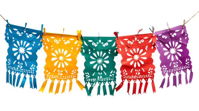 Colorful papel picado banner isolated on transparent background, traditional mexican decoration