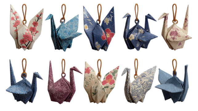 Origami Cranes: Delicate origami cranes, each uniquely crafted with patterned paper, are suspended, showcasing the beauty of this traditional art form and its intricate folding techniques.