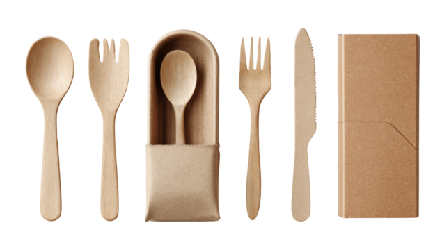 Brown paper package with wooden cutlery isolated on a transparent background