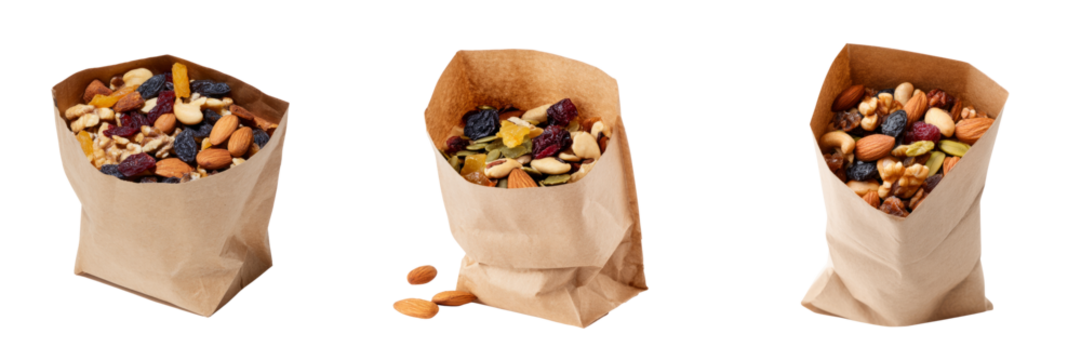 Healthy snack mix in eco-friendly paper bags studio setting transparent background