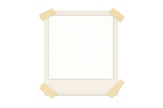 Blank instant film frame mockup with white paper affixed by adhesive tape, creating vintage nostalgia on a transparent background