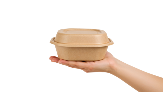 Hand holding a brown kraft paper food bowl with a lid, takeaway container. Isolated on transparent background, png