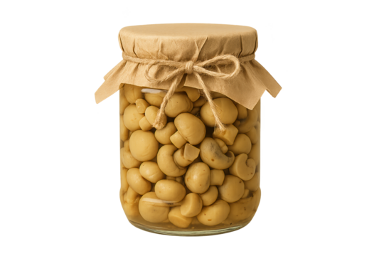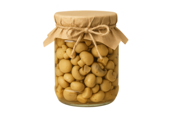 Glass jar filled with light yellow chickpeas, topped with brown paper and twine