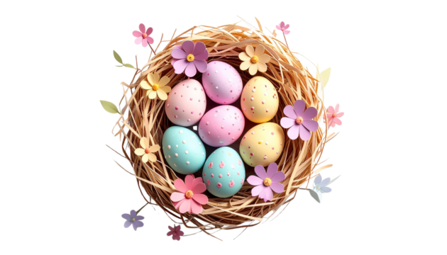 Paper-cut style Easter nest with layered straw shapes, pastel eggs, floral accents, handcrafted papercraft look, soft depth shadows, smooth edges, isolated on transparent background