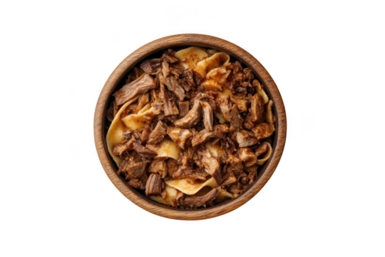 Delicious pappardelle pasta with duck ragu in wooden bowl, gourmet italian cuisine, food photography, isolated on transparent background