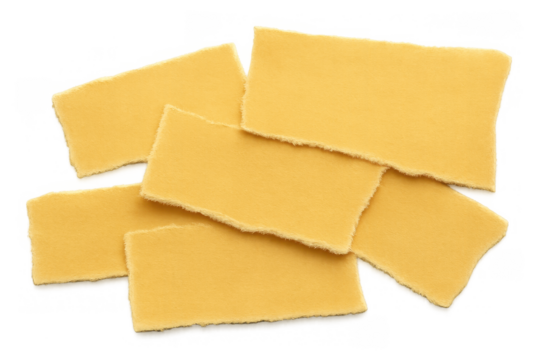 Uncooked pappardelle pasta pieces with torn edges on transparent background, top view, traditional italian food preparation