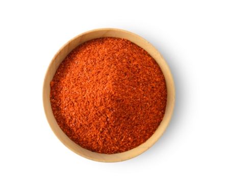 Dried and ground paprika powder on wooden bowl on a transparent background