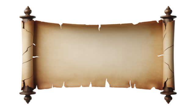 Ancient papyrus scroll with ornate wooden ends isolated on transparent background