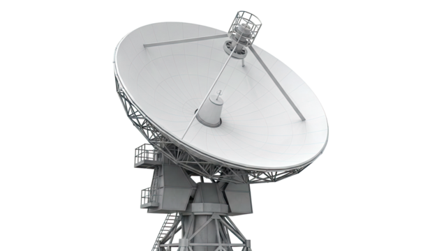 Large silver satellite dish isolated PNG on transparent background, communication technology for space exploration and scientific research