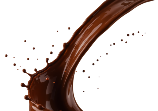 A viscous, highly reflective stream of pure dark chocolate, frozen in a dynamic parabolic arc with suspended droplets, macro lens, white studio background. Concept for premium food advertising