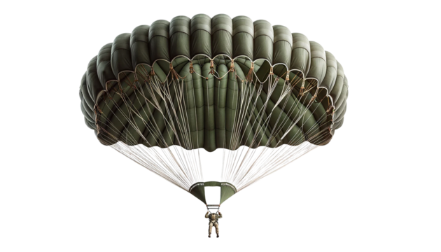 Military parachute isolated on a white background. The parachute features a large, durable canopy with suspension lines, harness, and rigging.
