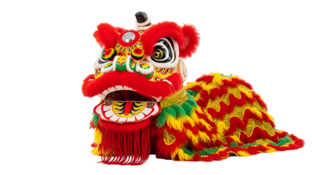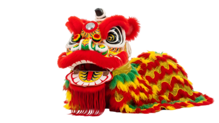 Colorful lion dance head on transparent background with red and yellow fabric
