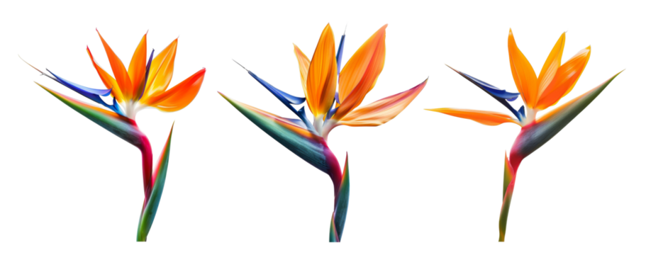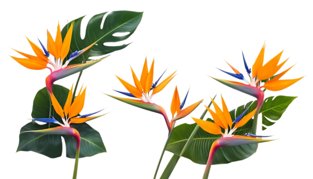 Striking bird of paradise plant featuring vibrant blooms and lush green foliage set against a deep transparent background