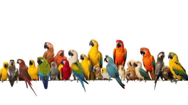 many different exotic pet birds, Parrots, parakeets, macaws in a row, isolated on transparent and white background.PNG image.