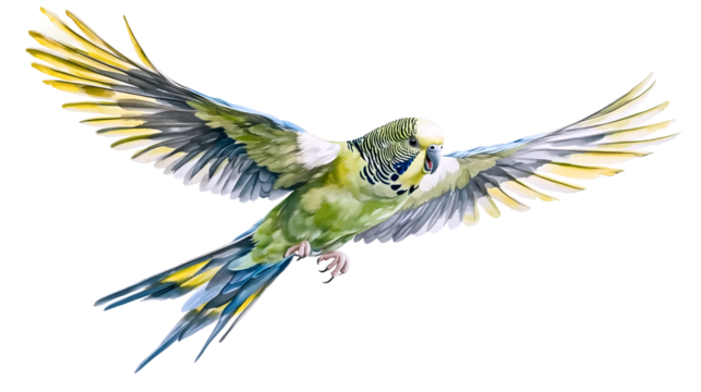 Isolated green and yellow budgerigar with wings spread ready to land on its feet in studio