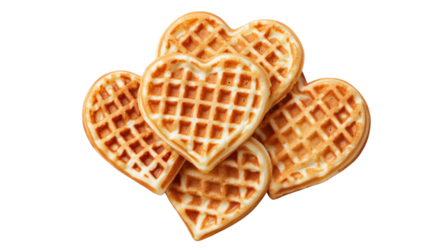 A visually appealing arrangement of heart-shaped waffles stacked neatly, with a crispy, golden-brown texture, isolated on a transparent background
