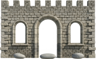 Ancient stone castle wall with arched entrance and windows featuring crenellated parapet and rounded cobblestones below medieval architecture fortress facade archway gateway transparent background