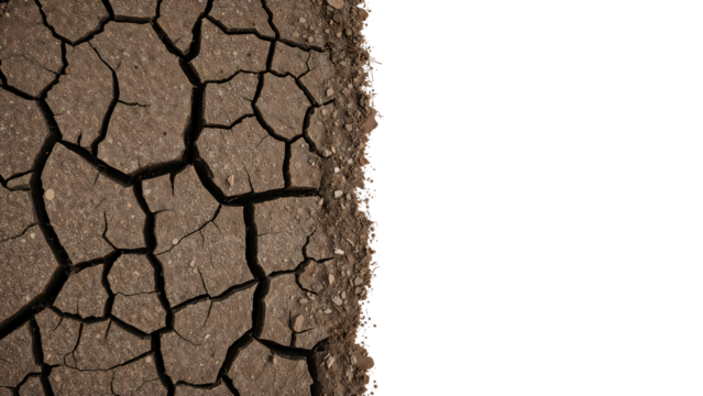 Cracked earth texture showing drought, water scarcity, and environmental problems, with a transparent background
