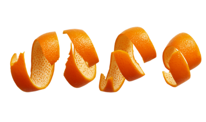 orange peels flying in the air on a white background, in a flat lay composition. isolated orange peel spirals flying in different directions, set against a transparent png background. flat lay.