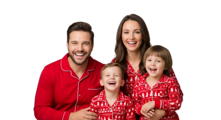Happy family of four in matching red holiday pajamas, smiling cheerfully, isolated on white & transparent background. Ideal for Christmas greeting cards, winter advertising,