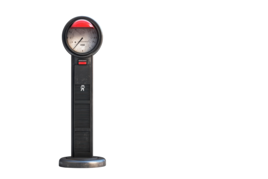 Expired old parking meters side by side, one showing violation isolated on transparent background