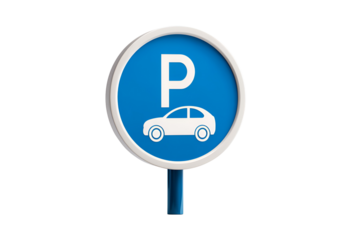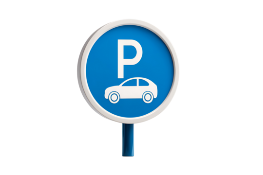 Blue parking sign with white p letter and word parking, indicating designated area for vehicles, transparent background