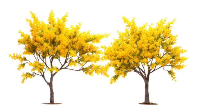 Set of Parkinsonia aculeata (сommon names palo verde, Mexican palo verde, Parkinsonia, Jerusalem thorn) blossoming frontal street trees isolated png on a transparent background perfectly cutout