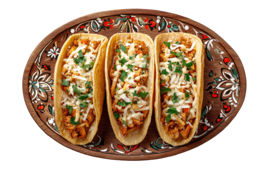 Three tacos arranged on a decorative oval plate.  Melted cheese, savory filling, and fresh herbs top the warm tortillas