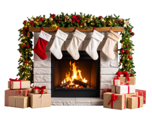 Cozy Fireplace Scene with Christmas Stockings and Decorations, transparent background PNG