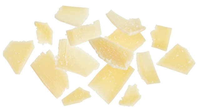Parmesan cheese pieces falling on transparent background