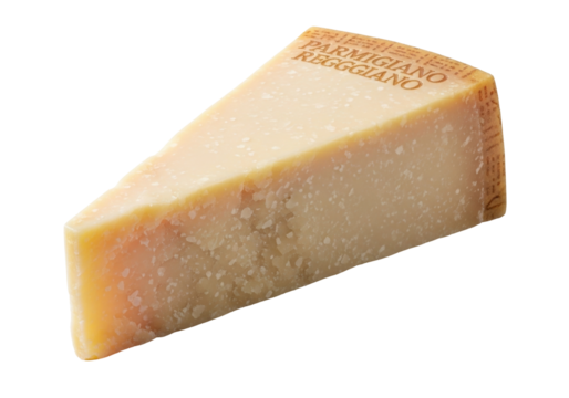 Isolated block of Italian parmigiano reggiano cheese, hard, granular, aged for cooking use