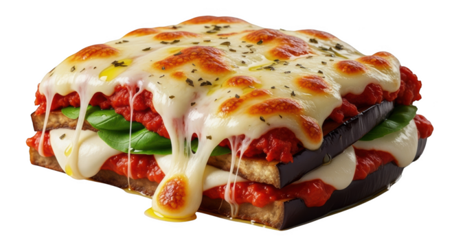 Eggplant Parmigiana with fresh basil, isolated on transparent background
