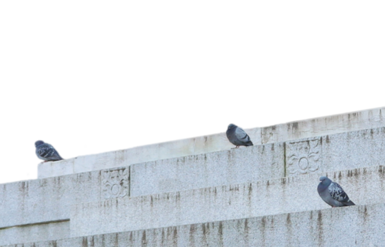 Pigeons on the monument stairs in public park, Bergamo, Italy. Urban architectural photography.