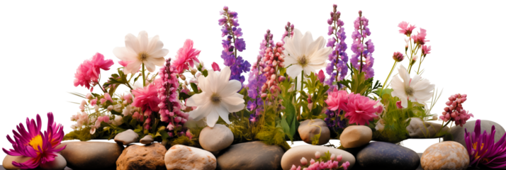Jardín de diferentes tipos de flores, piedras y vegetación aisladas sobre fondo transparente.