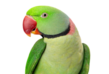 Hahn's macaw or red shouldered green parrot isolated on white background native to South America and Brazil for graphic design usage