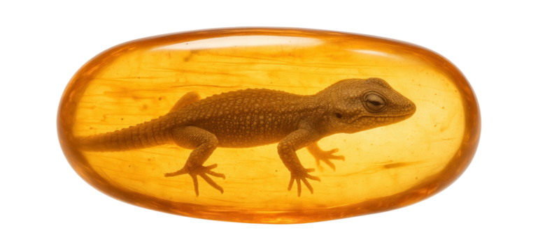 Amber inclusion of a small gecko, with visible scales and partial limb preservation