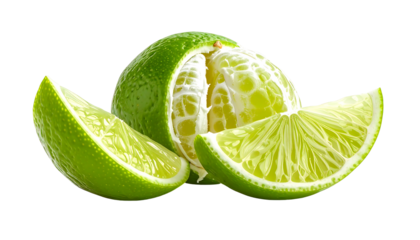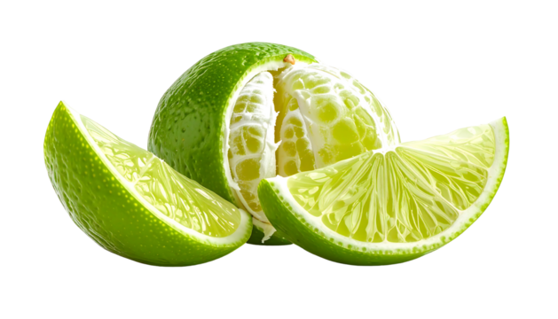 A vibrant lime, partially peeled, sits alongside two juicy lime wedges, showcasing its bright green flesh and textured rind against a black background