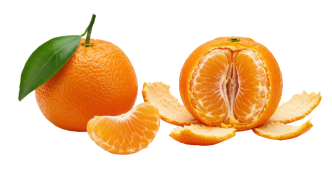 Ripe, plump mandarin oranges (whole with leaf, separated segment, partially peeled) glistening with juice on a transparent background with copy space, concept for healthy fruit advertising