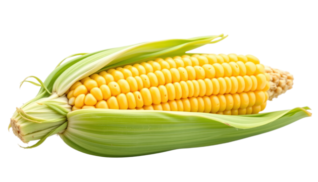 Isolated ear of corn with yellow kernels and green husk partially peeled back on black background on transparent background