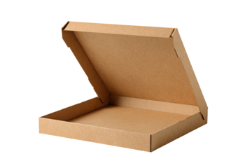 Empty, open square cardboard container, partially raised lid, plain brown color, isolated on black background