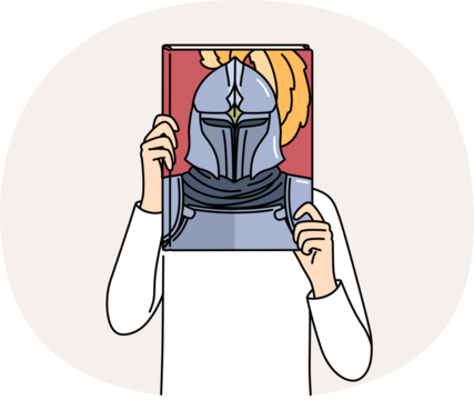 Book with knight on cover in hands of man covering face, reading literature about medieval soldiers. Man pretends to be knight in armor, dreaming of participating in gladiatorial tournaments.