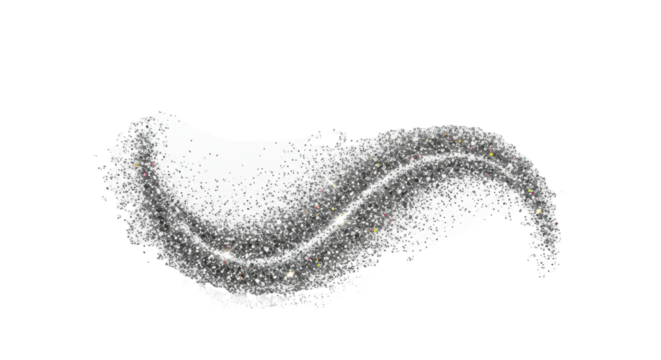 Shimmering silver glitter particles form a graceful, wave-like swirl with scattered dust, against a transparent background with high-key studio lighting and bokeh, concept of opulent celebration.