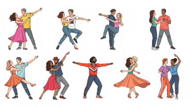 Couples dancing in various styles isolated on transparent background