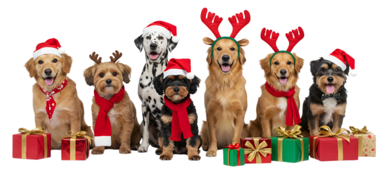 Group of christmas dogs wearing santa hats sitting with gift boxs and holiday sweaters isolated on a transparent background