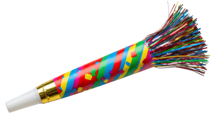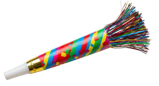 Colorful party noisemaker, shiny surface, casts shadows. Use for party favors, birthday branding, and product photography.