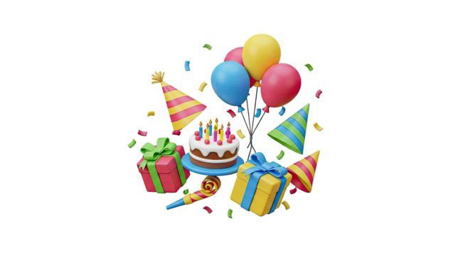 Colorful celebration theme with birthday cake balloons and gift boxes